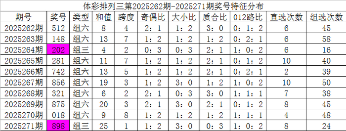 开奖公告:体彩排列三第2025271期开出奖号:898。组三,有重号:8,奇偶比1:2,大小比3:0,012比1:0:2,和值25,跨度1。