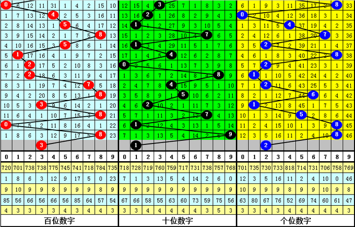 百位分析:该位最近10期出现范围在0-8之间,波动了9个点位,波动范围较大,上期开出号码8,上升了8个点位,本期看好该位号码下降。另外该位最近10期大小比为5:5,持平,本期看好小 号出现,参考号码3。